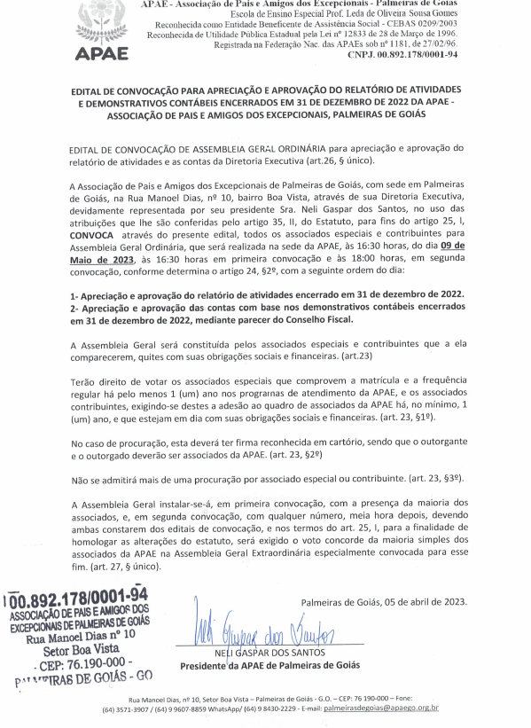 A APAE - PALMEIRAS DE GOIÁS CONVOCA A TODOS PARA A ASSEMBLÉIA DE APRECIAÇÃO E APROVAÇÃO DO RELATÓRIO DE ATIVIDADES E DEMONSTRATIVOS CONTÁBEIS DE 2022