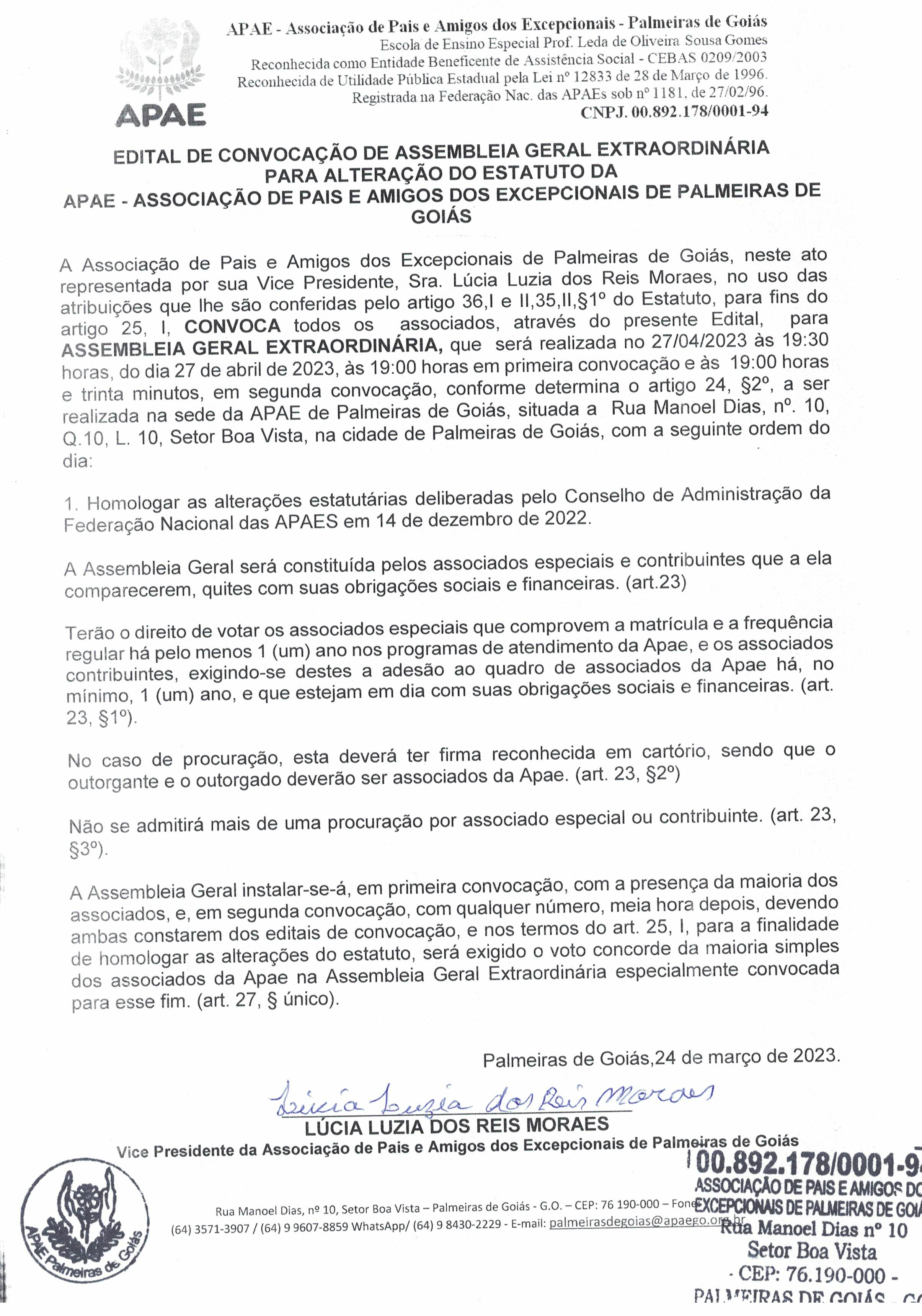 ⚠️ A APAE - PALMEIRAS DE GOIÁS CONVOCA A TODOS PARA A ASSEMBLÉIA GERAL EXTRAORDINÁRIA ⚠️ | Edital de Convocação