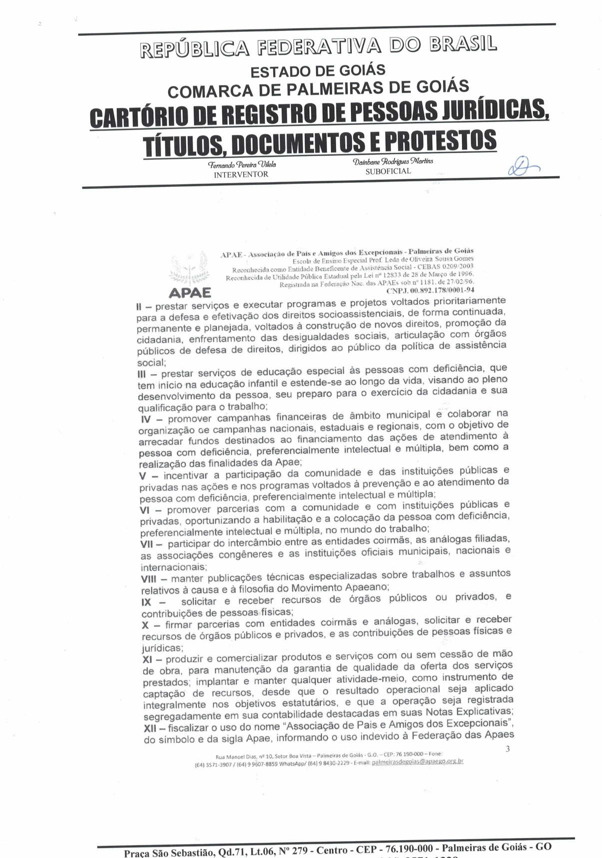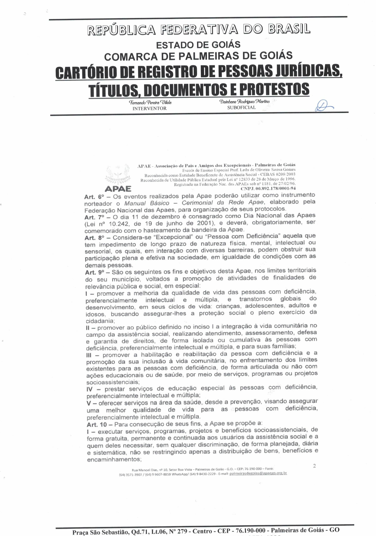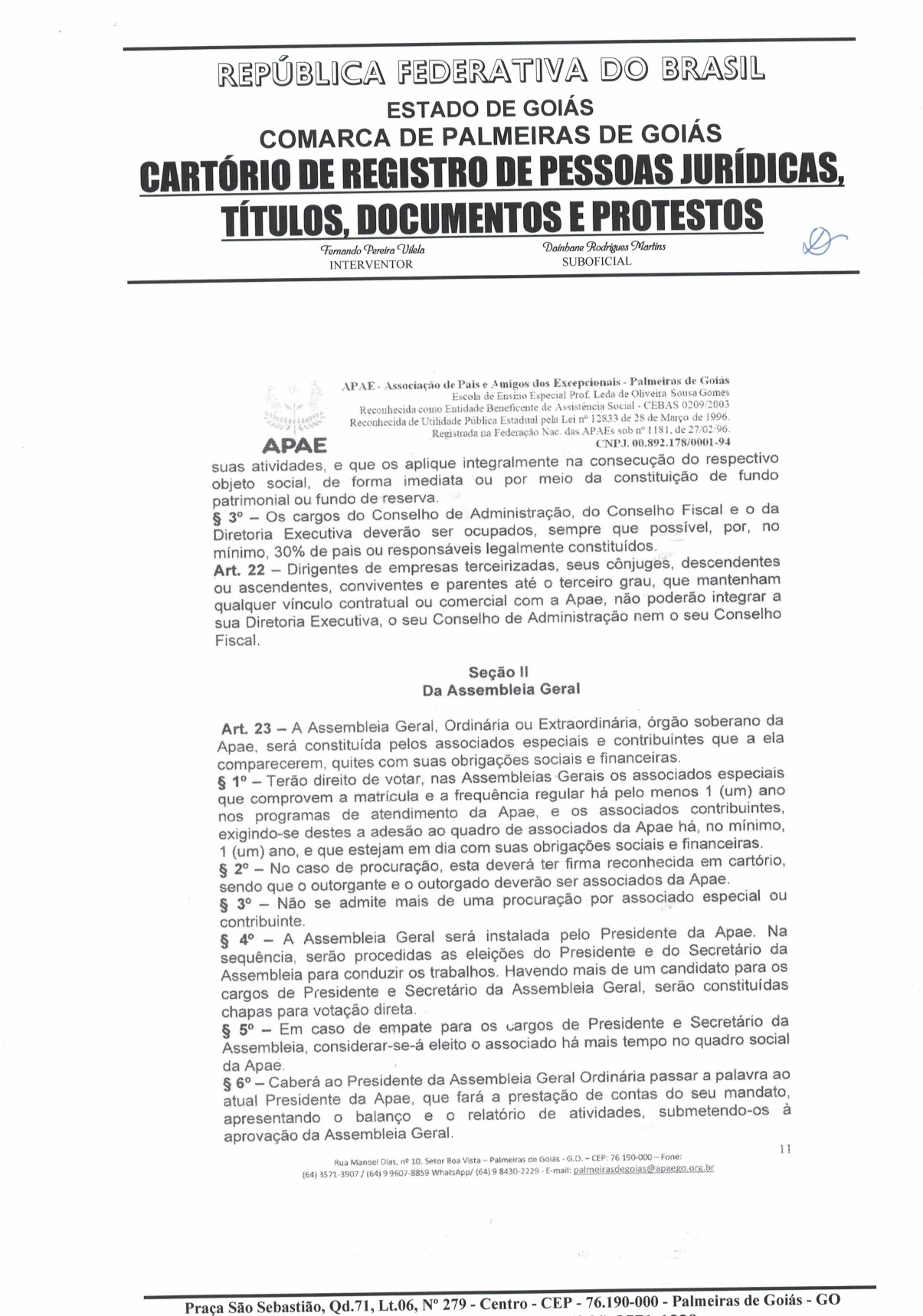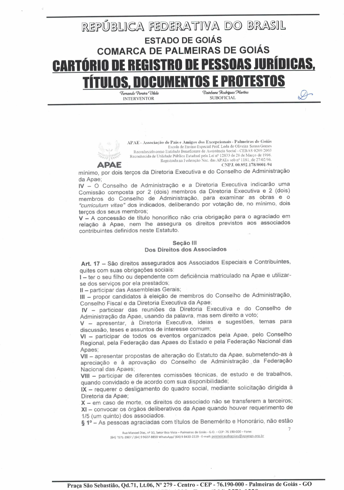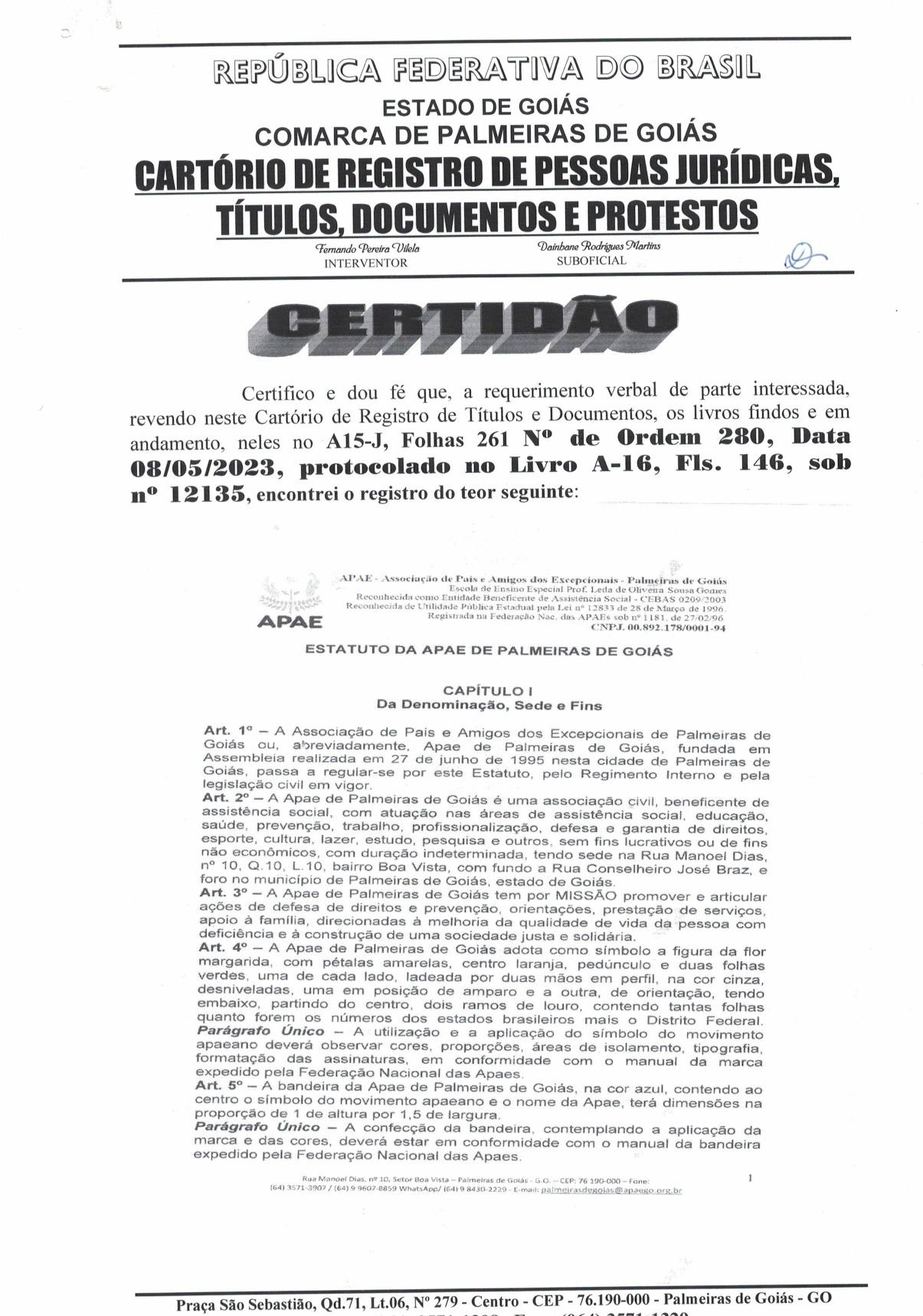 CERTIDÃO DO ESTATUDO DA APAE - PALMEIRAS DE GOIÁS 2023