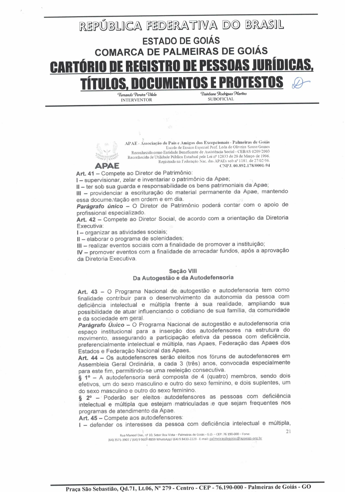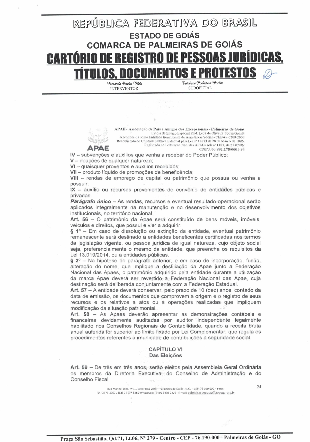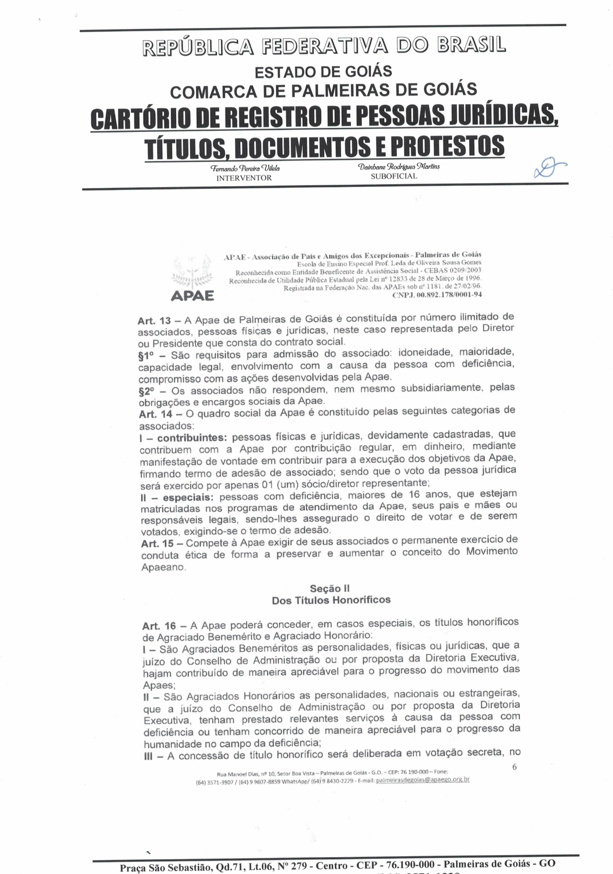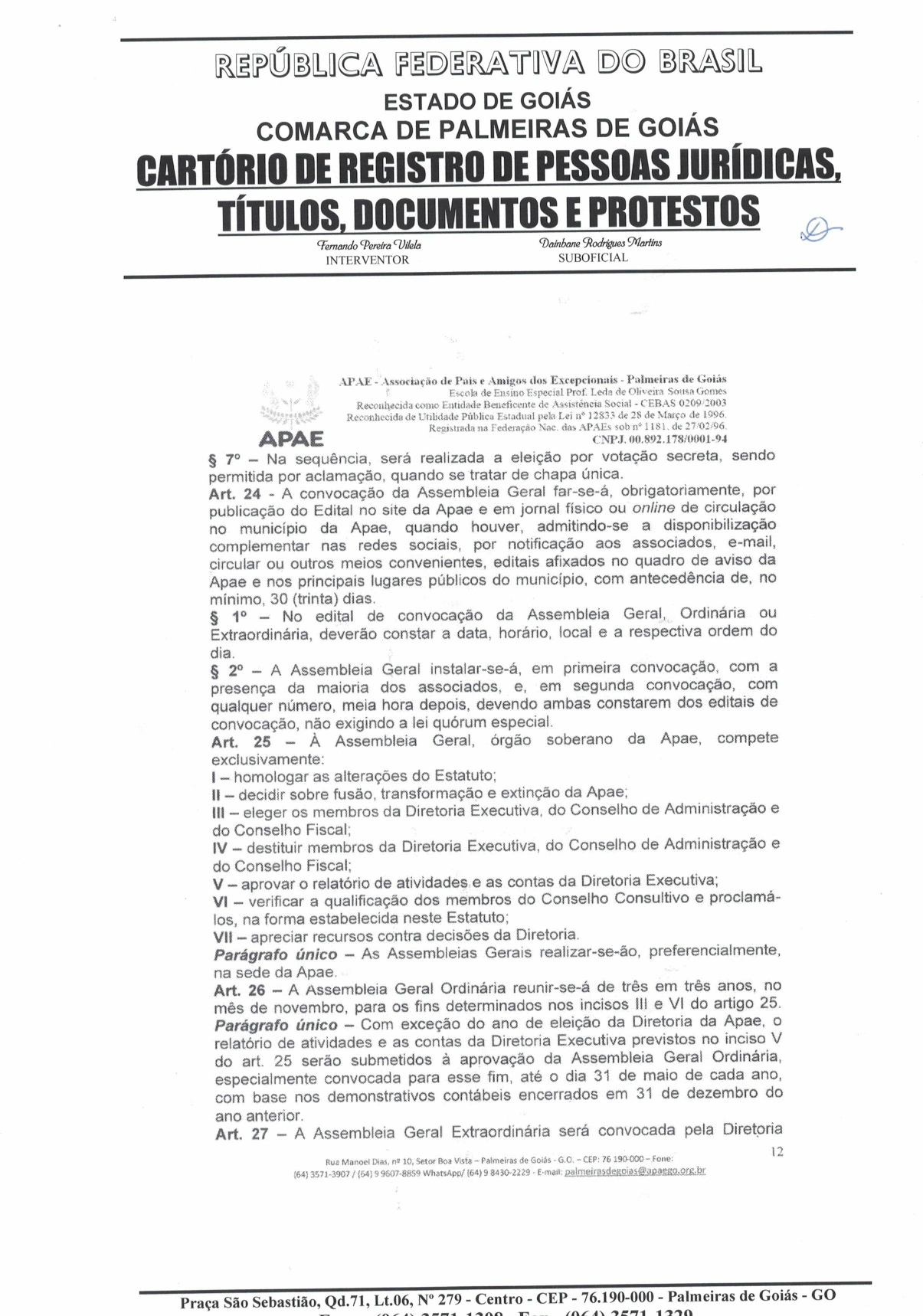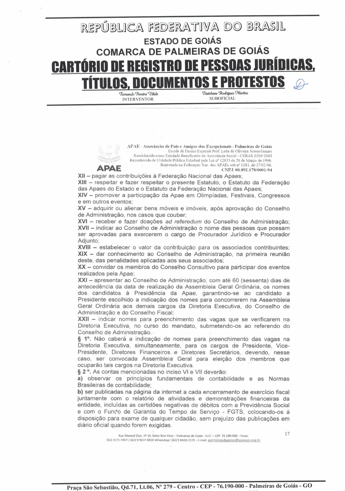 CERTIDÃO DO ESTATUDO DA APAE - PALMEIRAS DE GOIÁS 2023