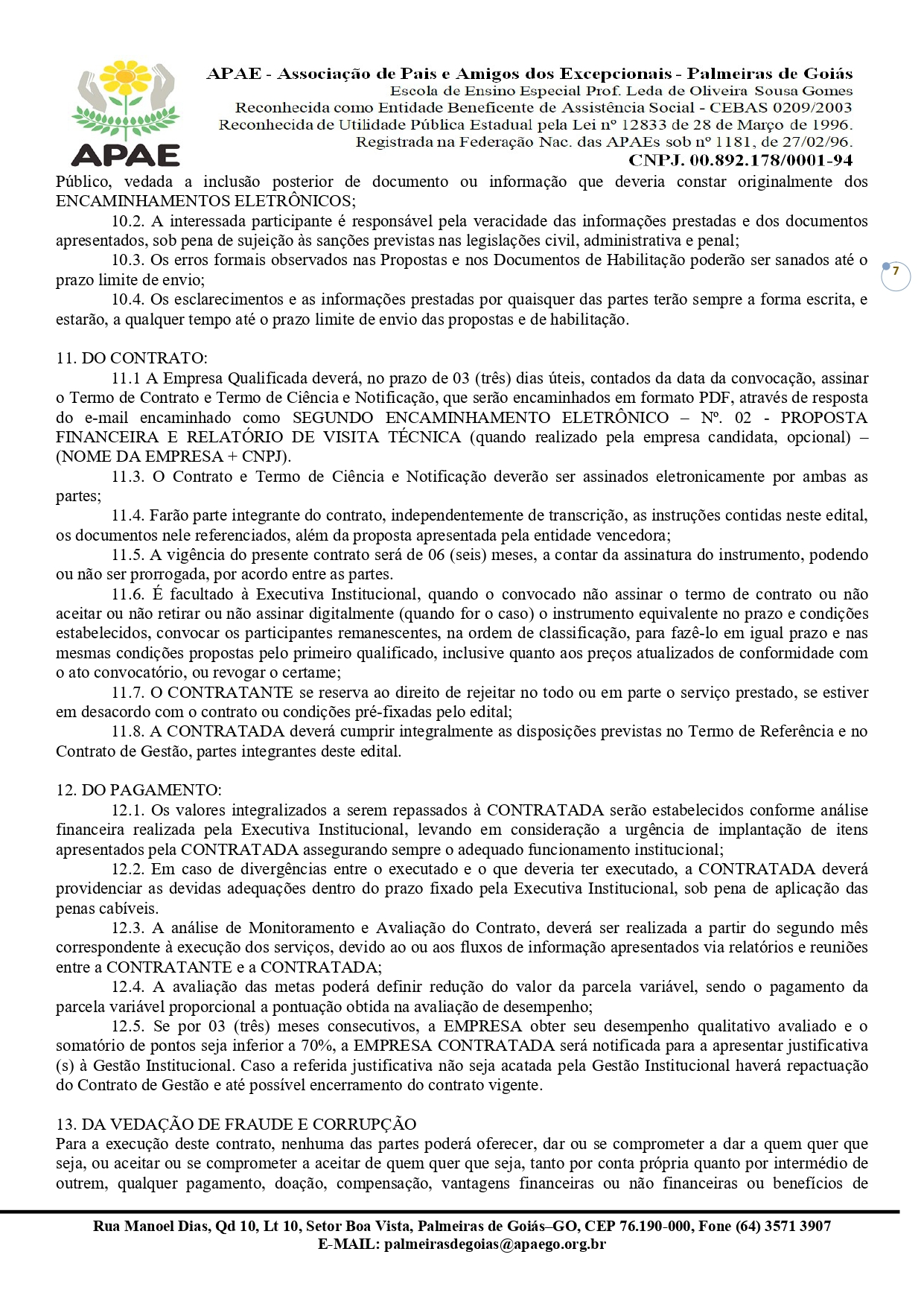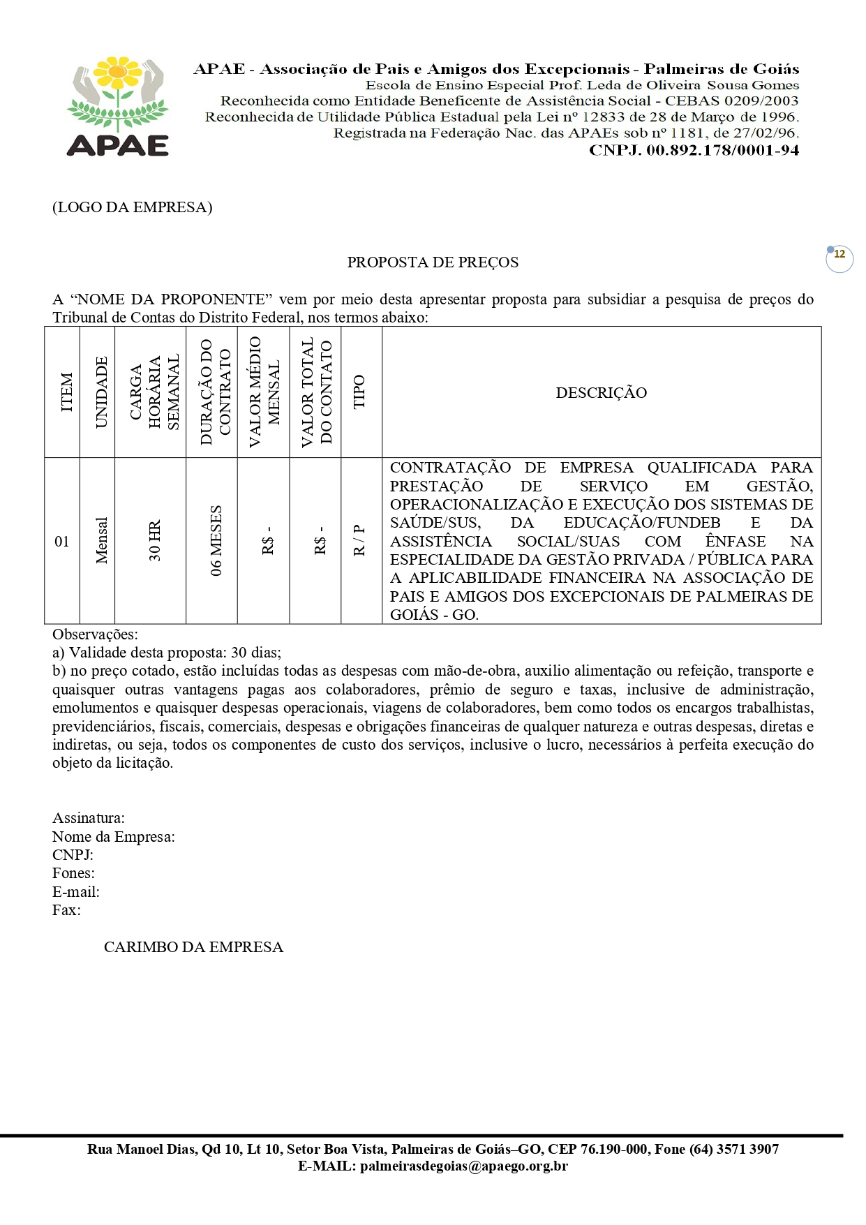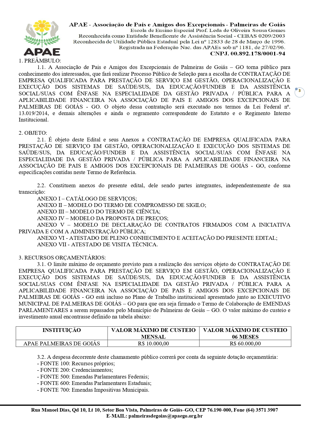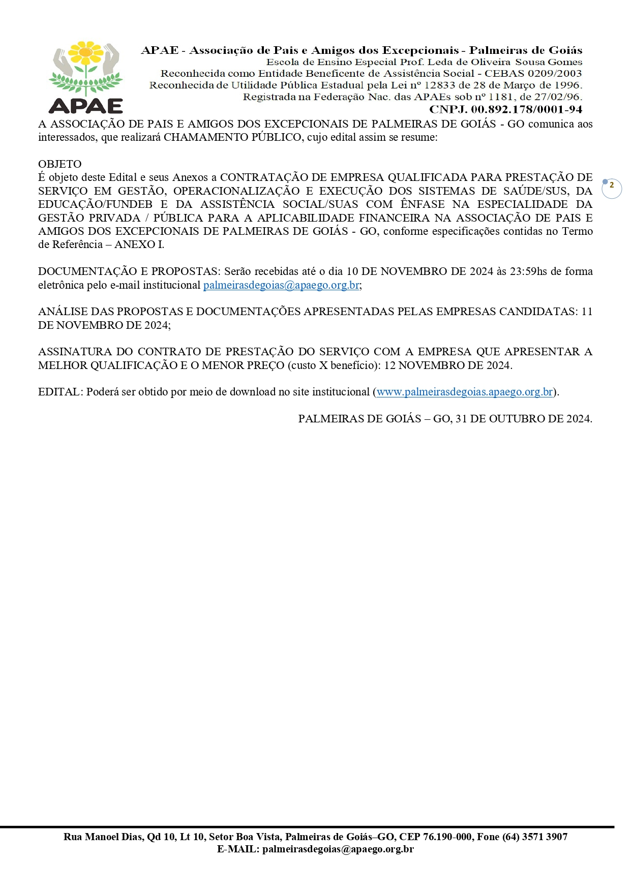 CONTRATAÇÃO DE EMPRESA QUALIFICADA PARA PRESTAÇÃO DE SERVIÇO EM GESTÃO, OPERACIONALIZAÇÃO E EXECUÇÃO DOS SISTEMAS DE SAÚDE/SUS, DA EDUCAÇÃO/FUNDEB E DA ASSISTÊNCIA SOCIAL/SUAS COM ÊNFASE NA ESPECIALIDADE DA GESTÃO PRIVADA / PÚBLICA PARA A APLICABILIDADE FINANCEIRA NA ASSOCIAÇÃO DE PAIS E AMIGOS DOS EXCEPCIONAIS DE PALMEIRAS DE GOIÁS - GO.