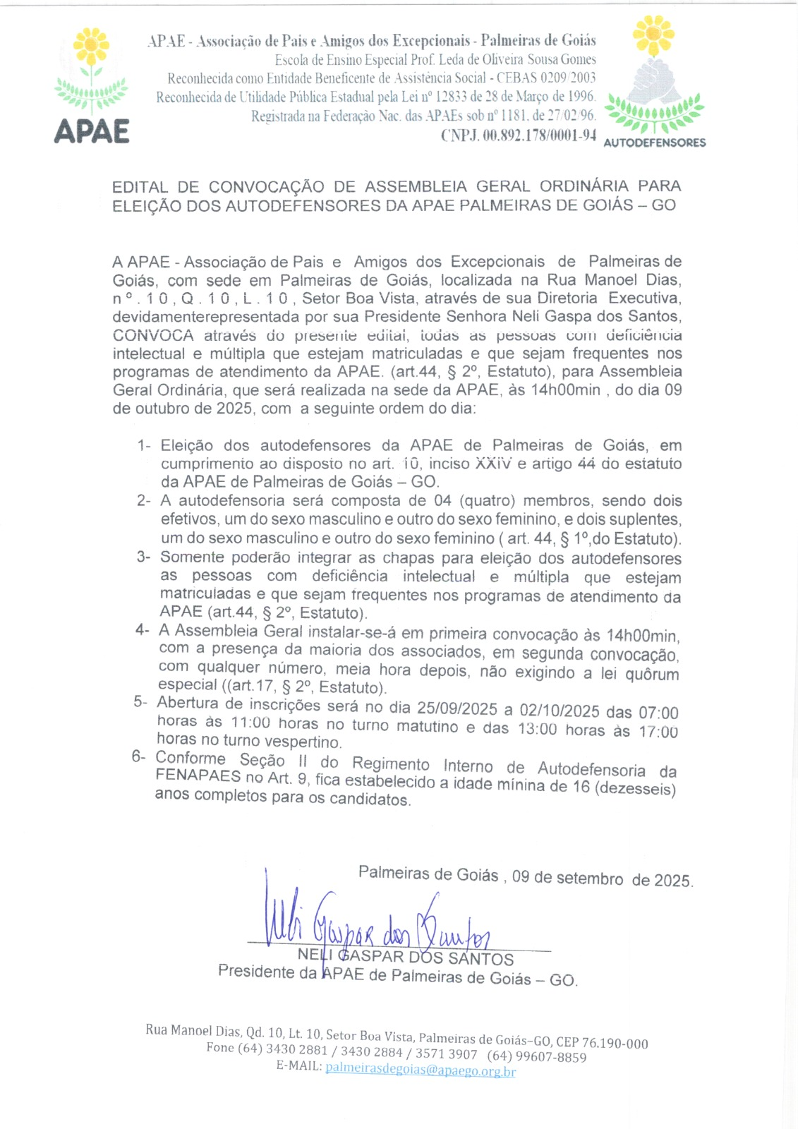 A APAE - Associação de Pais e Amigos dos Excepcionais de Palmeiras de Goiás CONVOCA através do presente edital, todas as pessoas com deficiência intelectual e múltipla que estejam matriculadas e que sejam frequentes nos programas de atendimento da APAE para Assembleia Geral Ordinária, que será realizada na sede da APAE, às 14h00min , do dia 09 de outubro de 2025 para a Eleição dos Autodefensores da APAE de Palmeiras de Goiás.