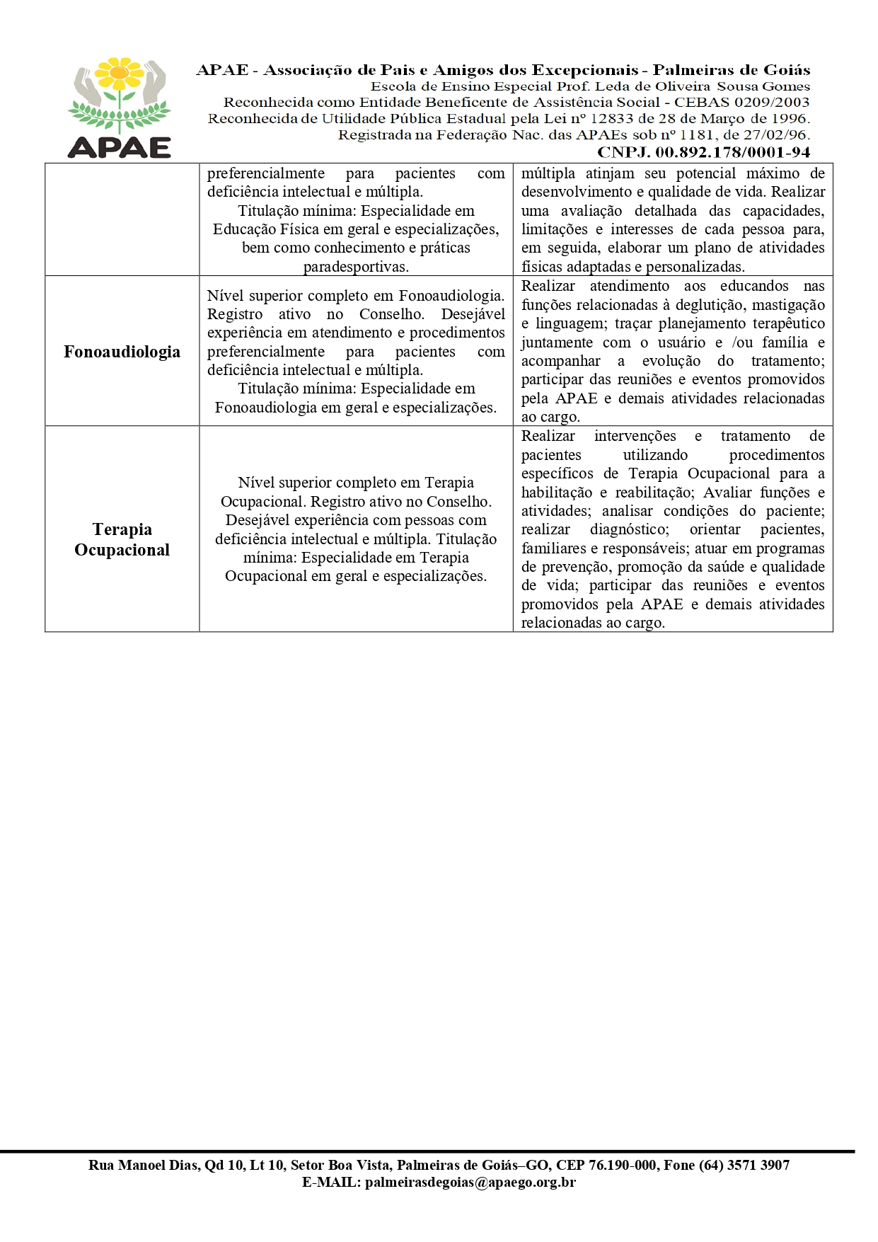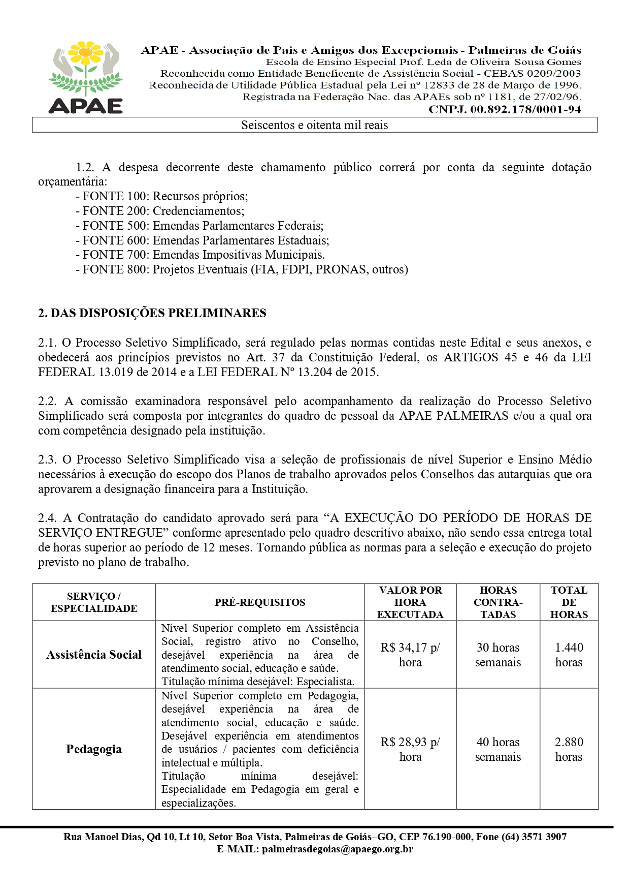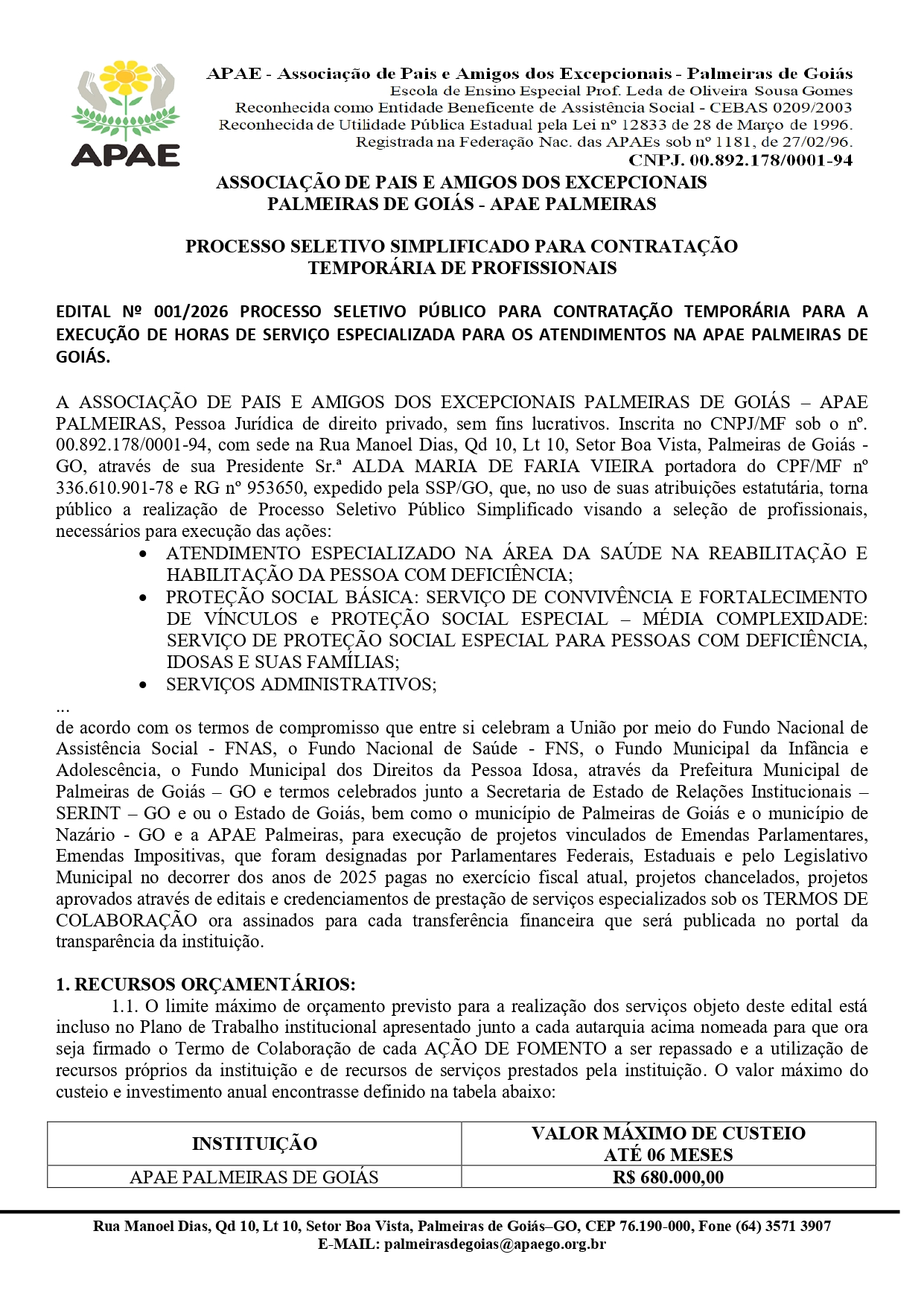 ERRATA EDITAL Nº 002/2026 PROCESSO SELETIVO PÚBLICO PARA CONTRATAÇÃO TEMPORÁRIA PARA A EXECUÇÃO DE HORAS DE SERVIÇO ESPECIALIZADA PARA OS ATENDIMENTOS NA APAE PALMEIRAS DE GOIÁS.