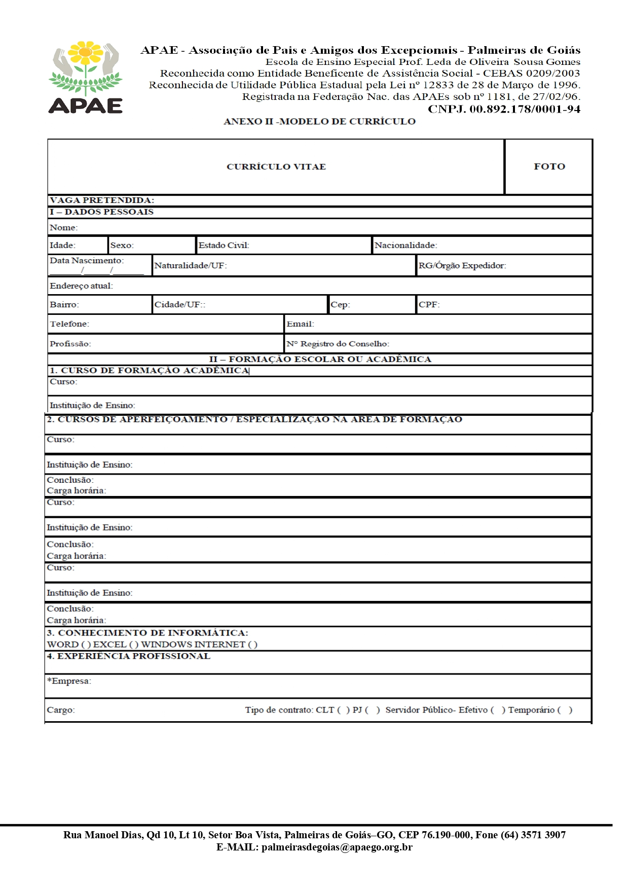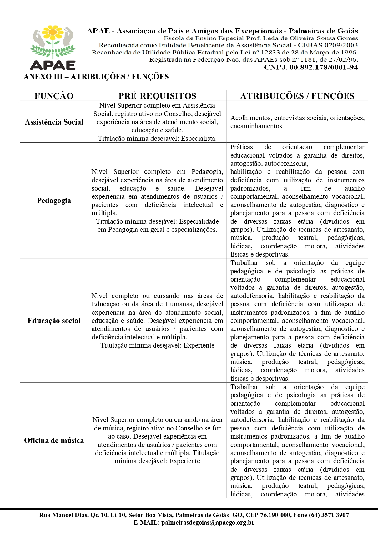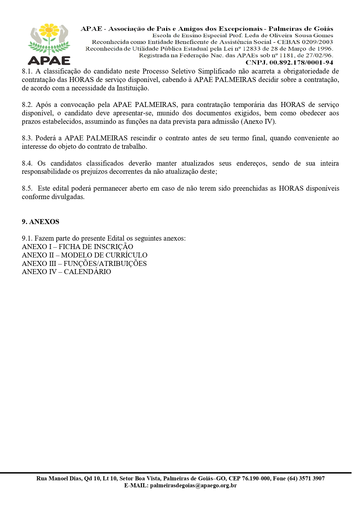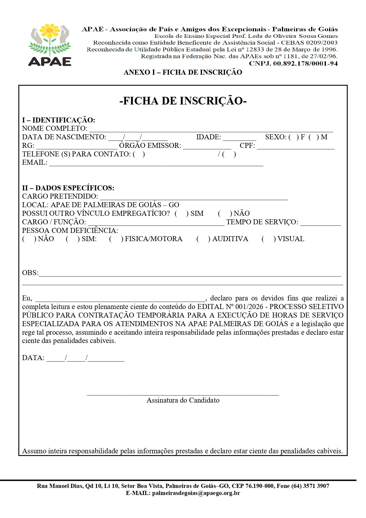 ERRATA EDITAL Nº 002/2026 PROCESSO SELETIVO PÚBLICO PARA CONTRATAÇÃO TEMPORÁRIA PARA A EXECUÇÃO DE HORAS DE SERVIÇO ESPECIALIZADA PARA OS ATENDIMENTOS NA APAE PALMEIRAS DE GOIÁS.